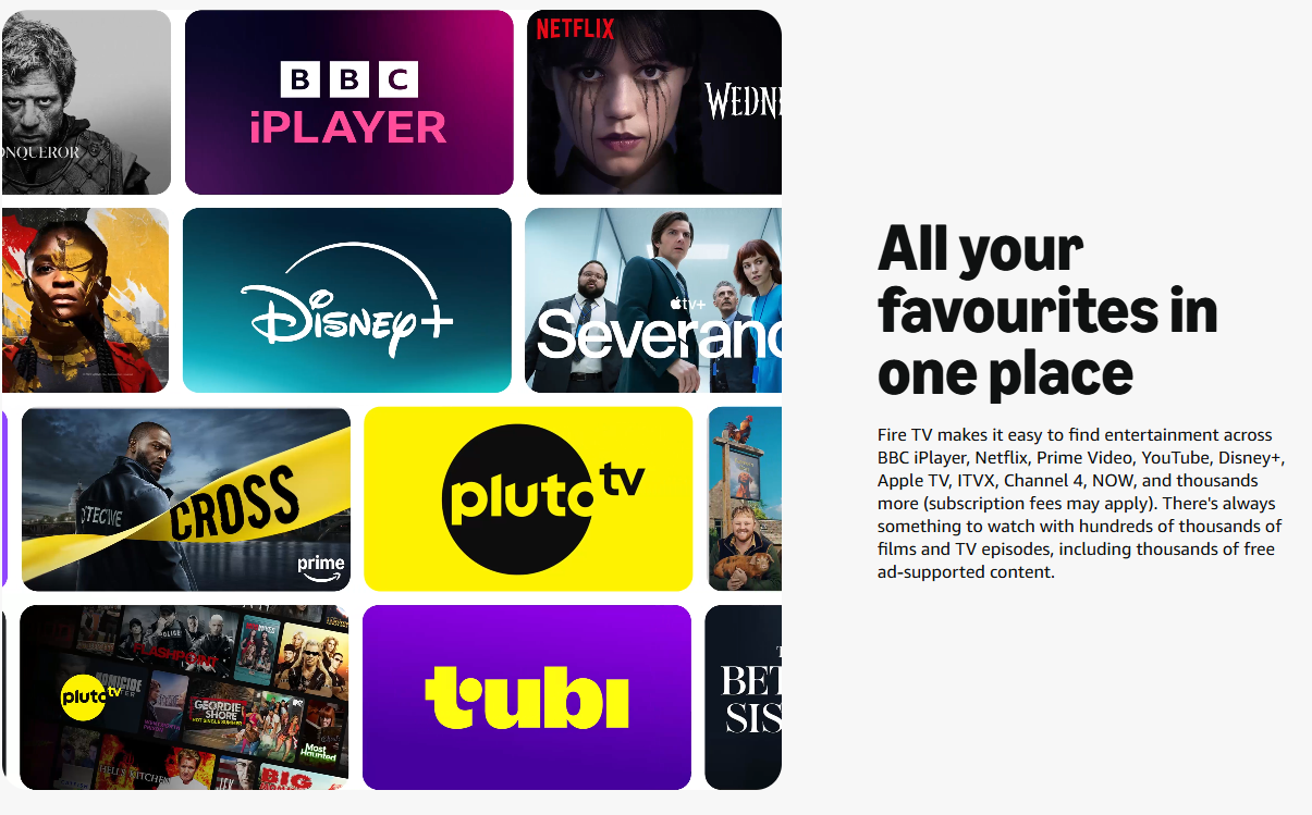 - All your favorites in one place – Experience endless entertainment with access to BBC iPlayer, Netflix, Prime Video, YouTube, Disney+, Apple TV, ITVX, Channel 4, NOW, and thousands more. Easily find what to watch from hundreds of thousands of films and TV episodes (subscription fees may apply), including thousands of episodes of free ad-supported content.