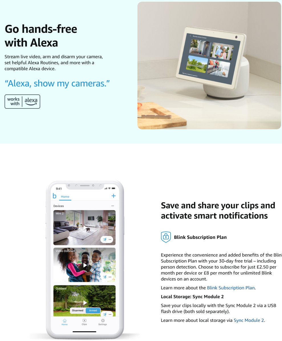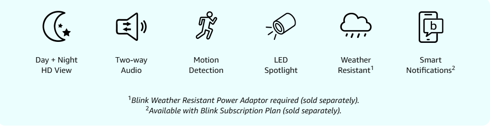 - Smart notifications – Get intelligent alerts including person detection with embedded computer vision (CV) as part of an optional Blink Subscription Plan (sold separately).