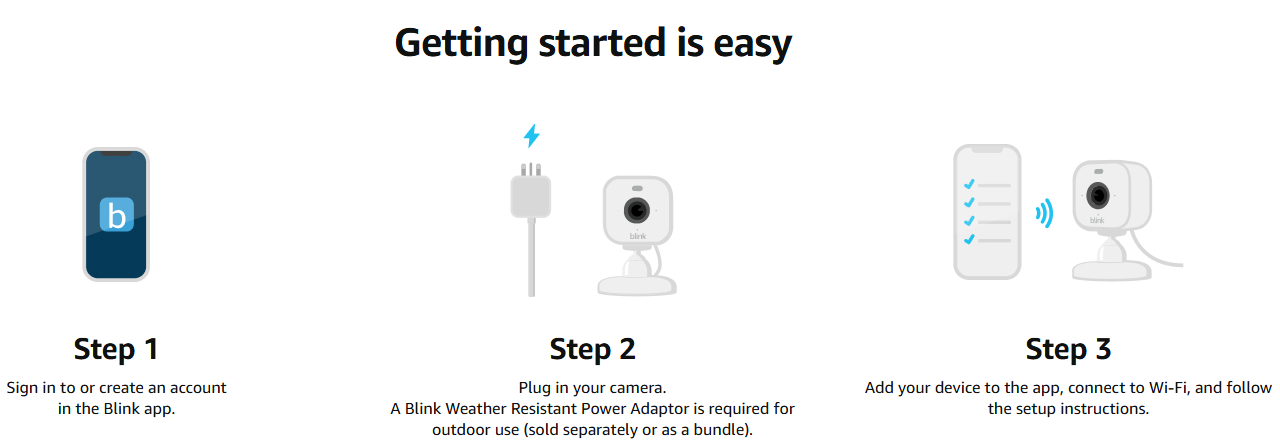- Outdoor use – Plug in Mini 2 outside your home with the Blink Weather Resistant Power Adaptor (sold separately or as part of a bundle) and mount with the included kit.