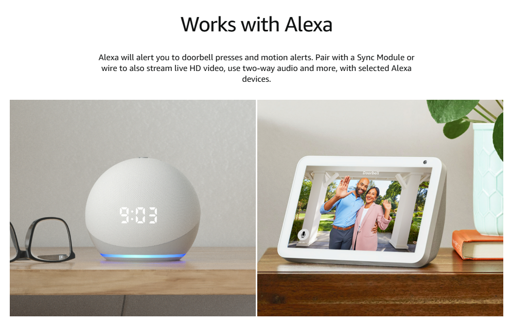 - Compatible with Alexa: Receive notifications and respond with two-way audio. When the Blink Video Doorbell is in cable mode or paired with the Sync Module, you can simply ask Alexa to answer the intercom.