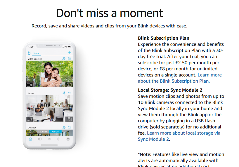 - Save and share videos locally with Sync Module 2 and a USB stick (sold separately) or in the Cloud with a 30-day free Blink subscription trial.