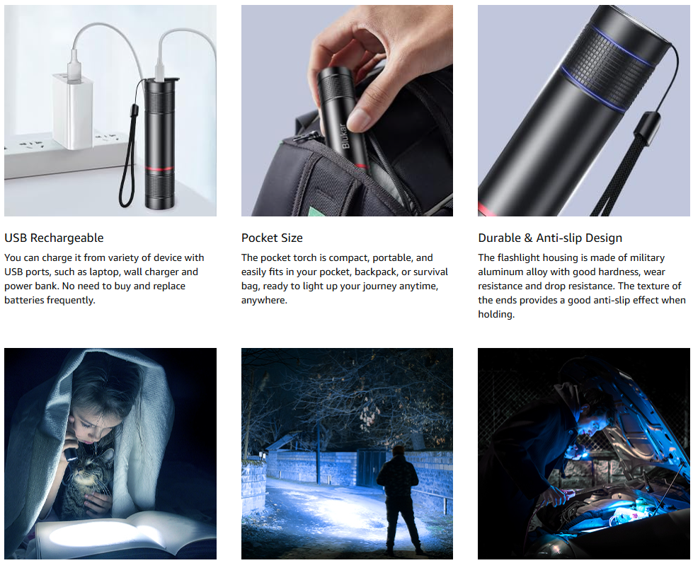 Blukar LED Torch Rechargeable, 2000L Super Bright Adjustable Focus Flashlight, 4 Lighting Modes, Long Battery Life, Waterproof Pocket Size Torch for Power Cuts, Emergency, Camping, Hiking, Outdoor [Energy Class A+++]