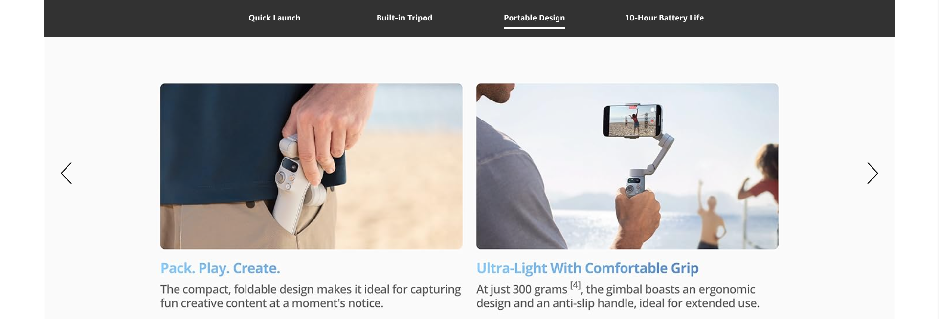 - Ultra-Light With Comfortable Grip - At just 300 grams [4], Osmo Mobile 7 boasts an ergonomic design and an anti-slip handle, making it the ideal phone gimbal for extended use.