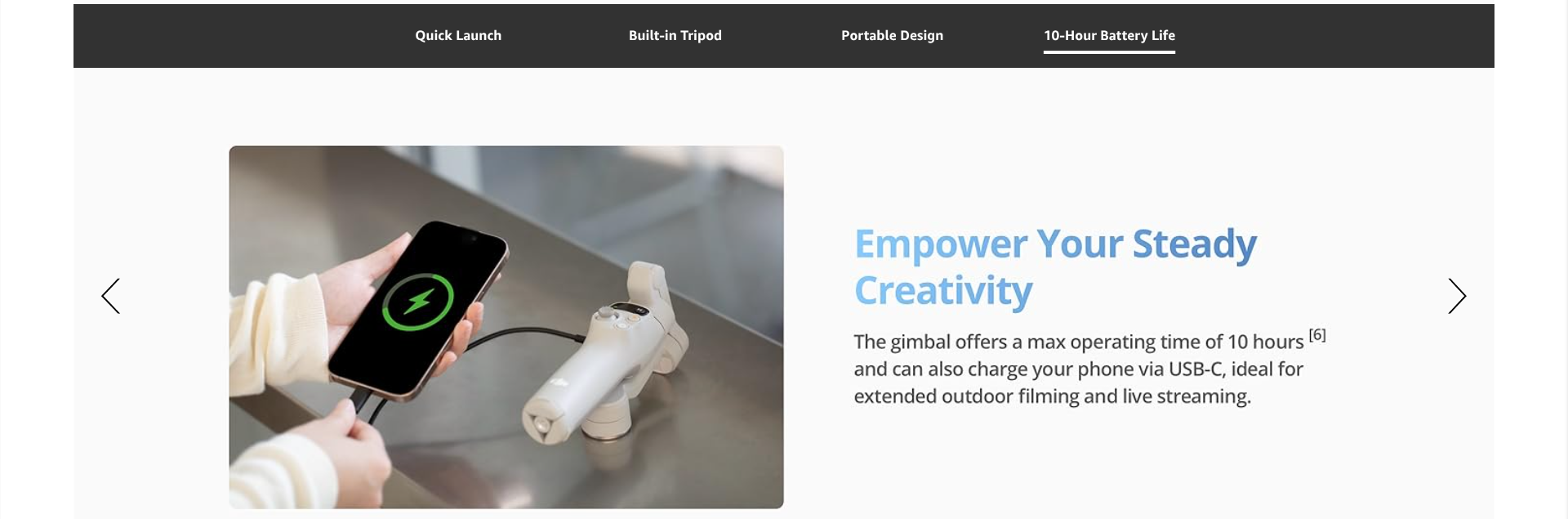 - Empower Your Steady Creativity - Osmo Mobile 7 offers a max operating time of 10 hours [6] and can also charge your phone via USB-C, ideal for extended outdoor filming and live streaming.