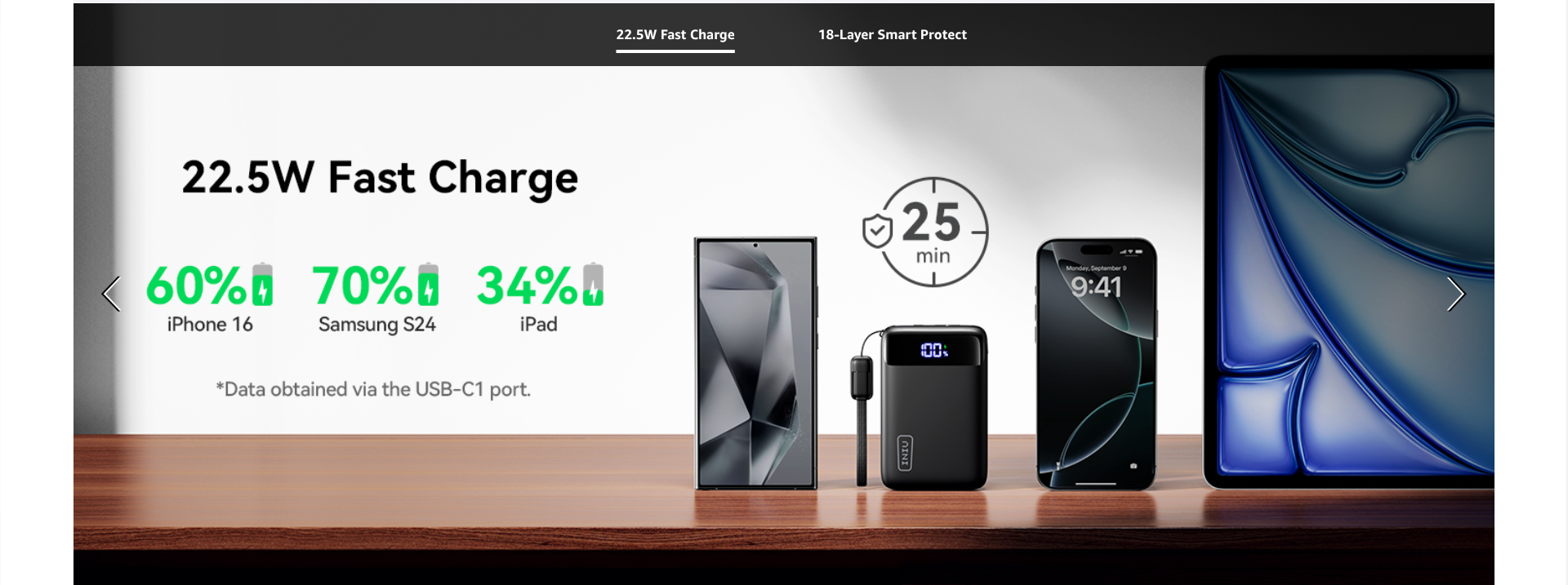 - 22.5W Fast Charging: Get 75% power in just 25 minutes. No need to hold the power bank all the time, keep up with your fast-paced life!