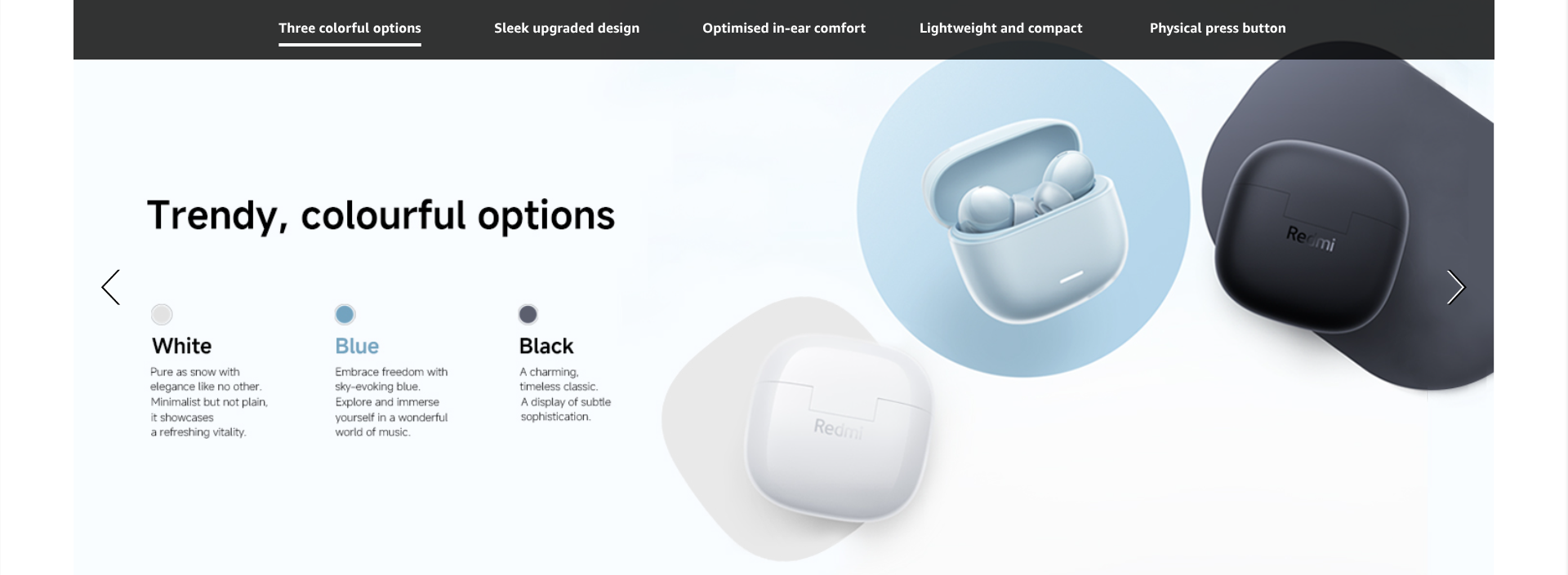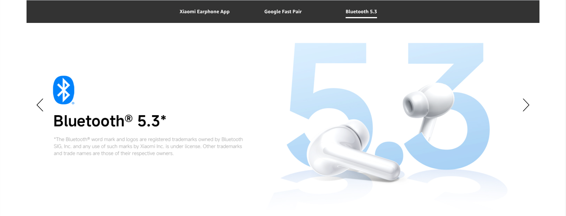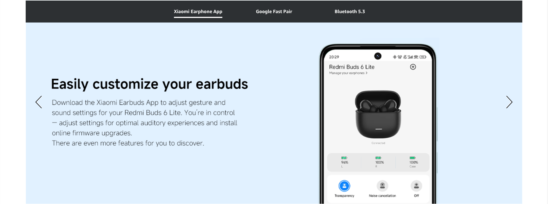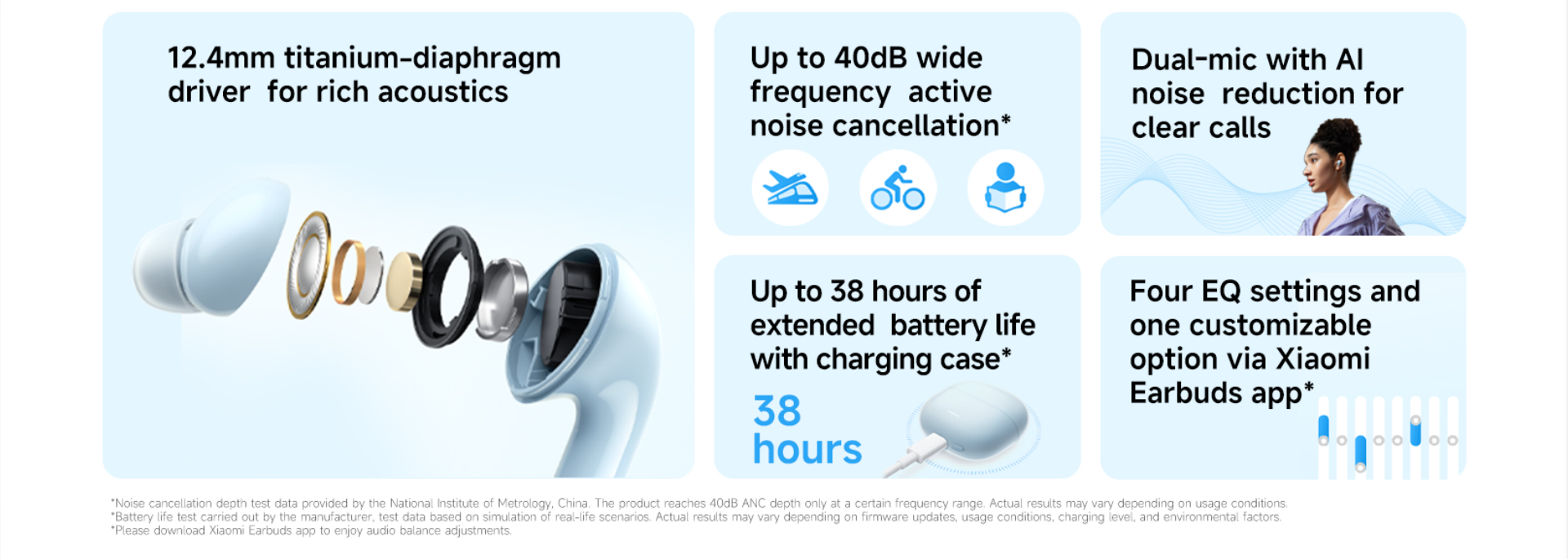 - Four EQ settings and one customizable option via Xiaomi Earbuds app*:Adjust sound quality to suit your preference, personalised listening for a unique experience. Custom EQ settings Infinite possibilities for an indulgent auditory experience.