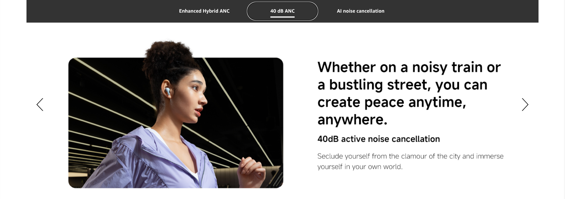 - Up to 40dB wide frequency active noise cancellation*:Whether on a noisy train or a bustling street, you can create peace anytime, anywhere. 40dB active noise cancellation. Seclude yourself from the clamour of the city and immerse yourself in your own world.