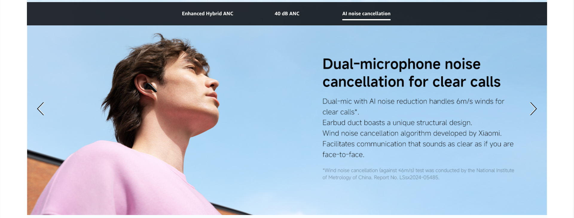 - Dual-mic with AI noise reduction for clear calls:Dual-mic with AI noise reduction handles 6m/s winds for clear calls*. Earbud duct boasts a unique structural design. Wind noise cancellation algorithm developed by Xiaomi. Facilitates communication that sounds as clear as if you are face-to-face.