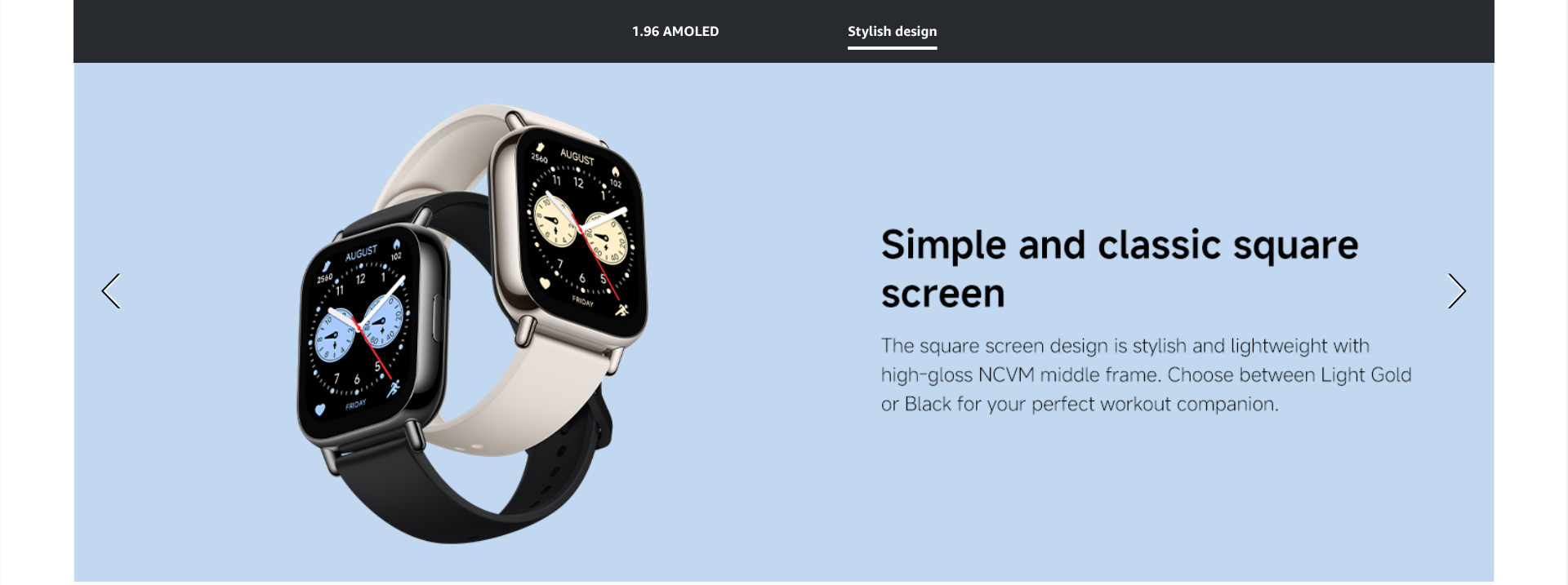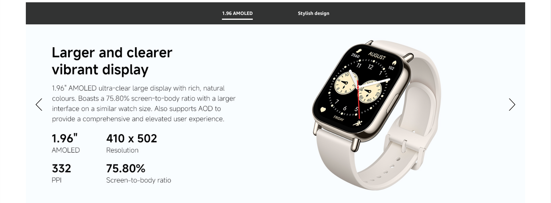 - 1.96” AMOLED Display with AOD: Features a vibrant AMOLED screen with Always-On Display and 410×502 resolution for sharp visuals and easy viewing anytime.